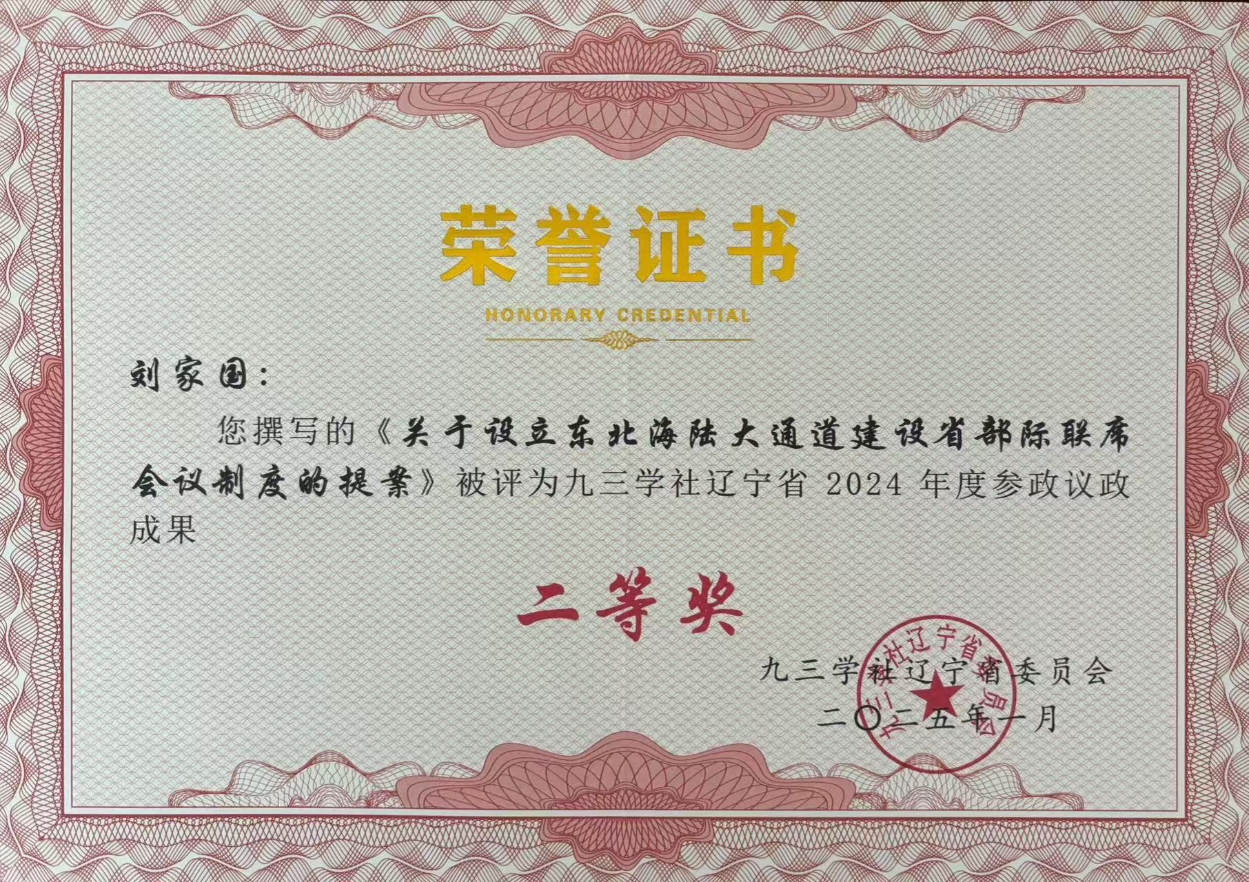 社省委 2024 年度参政议政成果二等奖:刘家国